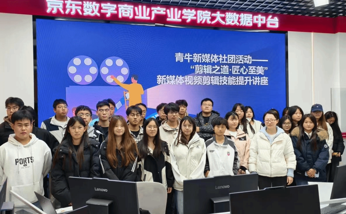 2025年11月4日晚,由机电青牛新媒体社团承办的“剪辑之道·匠心至美”新媒体视频剪辑技能提升讲座,在七号实训楼一层大数据分析中心举行。社团团员及全校学生约50人参与,活动由青牛新媒体社团负责人郭正宇主持。